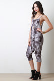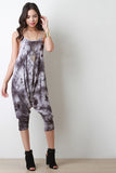 This sassy jumpsuit features a thermal knit fabrication, tie dye print, spaghetti straps, scoop neckline drop armholes and back, loose draped fit with a drop crotch design and tapered cropped legs. Accessories sold separately. Made in U.S.A. 97% Rayon, 3% Polyester.