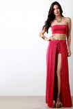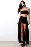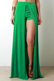 This sleek skirt features a smooth stretchy knit fabrication, open front design with inside shorts, high waisted fit, and elasticized wide waist band. Finished with a maxi-length hemline. Accessories sold separately. Made in U.S.A. 95% Polyester, 5% Spandex.