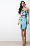This modern dress features a bold color blocked design, knit fabrication. curve hugging bodycon fit, bustier top, adjustable elastic spaghetti straps, exposed zipper closure and a mini length hemline. Accessories sold separately. 95% Polyester, 5% Spandex.