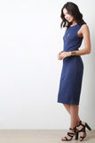 This  midi dress  features speckled knit, round neckline, and finished with cutout twisted back. Accessories sold separately. Made in USA. 92% Polyester, 8% Linen.