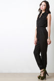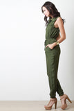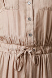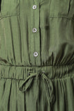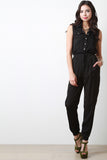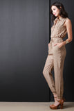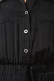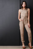 This stylish jumpsuit features button-up front, classic collar, two breast pockets, elasticized waist with self-tie drawstring, and two pant pockets. Accessories sold separately. 100% Rayon.