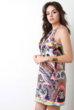 This shift dress features a self tie mock neck. gather details, sleeveless design, knit fabrication, colorful abstract paisley print, and a mini length hemline. Accessories sold separately. Made in U.S.A. 95% Polyester, 5% Spandex.